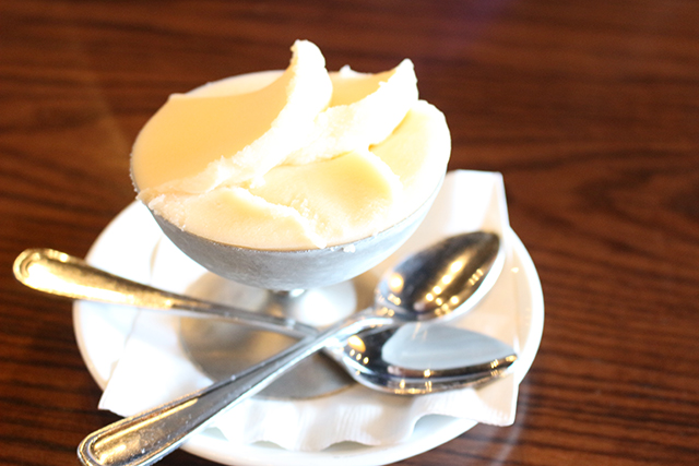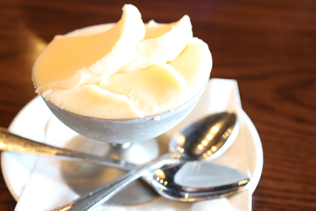 I guess the polite thing to do after eating a 5-course meal is to say “no thanks” when it’s time for dessert. But who are we kidding? Bring on the sweet stuff! The melon sorbet made me weak in the knees. Each bite melted so easily in my mouth and I was left with the taste of pure perfection. Imagine finding the ripest, sweetest melon you could find, then turning it into a frozen treat. Babbo did that! The nice thing about this dessert is that even after a feast like mine, it did not make me regret ordering it because it was so refreshing and light. It really did taste like eating a piece of fresh fruit but even better because the texture was like a bite of air… frozen sweet air that is. No regrets here, friends!