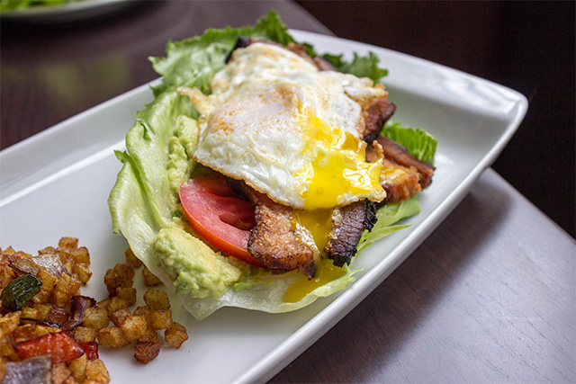 As the last entrée, I ordered the Breakfast Sandwich without the bun, which was still delicious. The sandwich consisted of crisp pork belly with avocado mayo and an over easy egg atop lettuce. I was especially obsessed with the pork belly, which was thick cut and meaty, unlike many brunch places that skimp on thickness. This dish also came with Bar Deco’s home fries, which were finely diced, crispy potatoes with sautéed peppers. I had never seen home fries diced so finely, but doing this allowed them to become extremely crispy, which is something I definitely look for in a home fry.