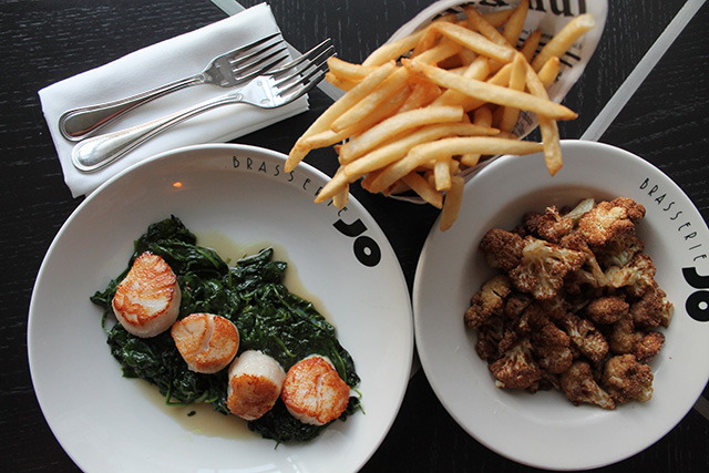 My waiter definitely stared at me with confusion as I ordered multiple items… to enjoy with no other company. And I don’t even want to know what the restaurant thought when I completely devoured all of the dishes! To start, I had to order the crispy cauliflower (yogurt on the side). The cauliflower is flash-fried in a fryer, and subject to cross contamination, so if you are sensitive to this preparation you will have to sit the dish out. The cauliflower literally tasted like candy! I finished the whole bowl in minutes, and the portion was super generous! I also ordered the French Fries, because how could I go to a FRENCH Bistro and not order the FRENCH fries??! Thin and crisp, the fries were perfect! (Also cooked in a shared fryer). For my main course I was torn between the salmon cooked in a lemon beurre blanc, the scallops on corn with smoked bacon and fingerling potatoes, and the tuna nicoise salad. I haven’t had scallops in forever, and prior to going to the restaurant I totally stalked their Instagram and saw the scallops, and that pretty much made up my mind! I subbed out the corn and bacon and added spinach to the dish!
