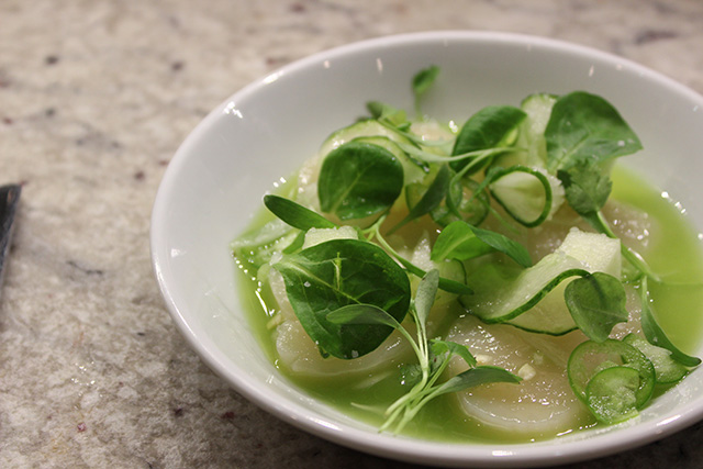 Nearly all items were gluten-free and sharing was encouraged. From the ‘Botanas,’ we had the Tostada and Crudo. The former consisted of Marina di Chiogga, Cauliflower Escabeche, Shaved Brussels, Pomegranate seeds, and Chile Cascabel atop a slightly crisped corn tostada. If you can’t handle spice, beware; there are some jalapenos hidden beneath the topical goodness, and the chili adds a nice kick. The Crudo was the perfect complement to the former, spicier dish. The scallops were some of the best we’d had, paired with apple, cucumber, and Serrano.