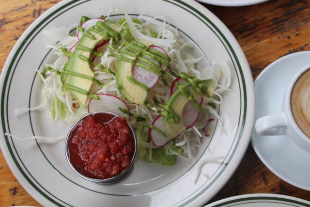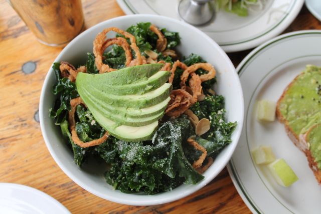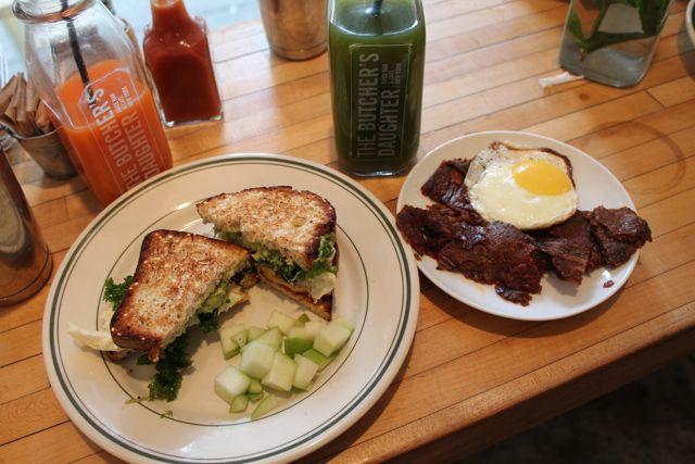 Butcher’s Daughter is incredibly nobread friendly, and the majority of the delicious non-gluten free items, ie. the avocado toast, can be ordered gluten free by asking for gluten free bread! The most popular, and most photographed dishes at The Butcher’s Daughter are the avocado toast, kale salad with avocado, sunflower seed tahini, green apples, toasted sunflower seeds, and smoked sea salt, and the tacos verdes. The kale salad and tacos are 100% gluten free, and the tacos are made out of romaine lettuce ‘tortillas’ and filled with tempeh, avocado crema, radish, cilantro, and salsa. These three dishes are absolutely incredible and I could happily eat them for each meal of the day. For breakfast, I always order a side of the adzuki bean bacon and top it off with a poached egg for added flavor. The bacon is unlike any other bacon out there, and I highly recommend it. I also love the egg sandwich with scrambled eggs, cashew cheese, kale, avocado, and tomato jam, on gluten free bread, of course! Oh, and I can’t forget! The Butcher’s Daughter is incredibly popular for their juices. My favorite is the Green Juice; made out of cucumber, kale, and green apple.