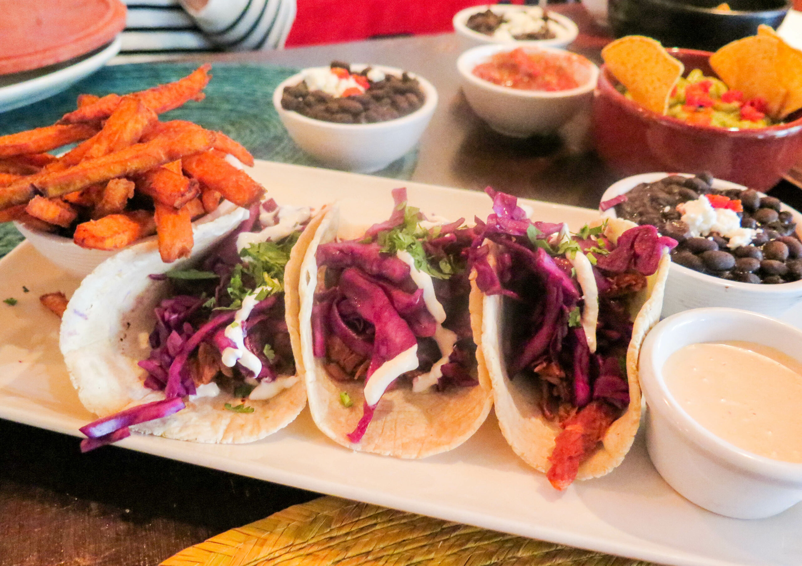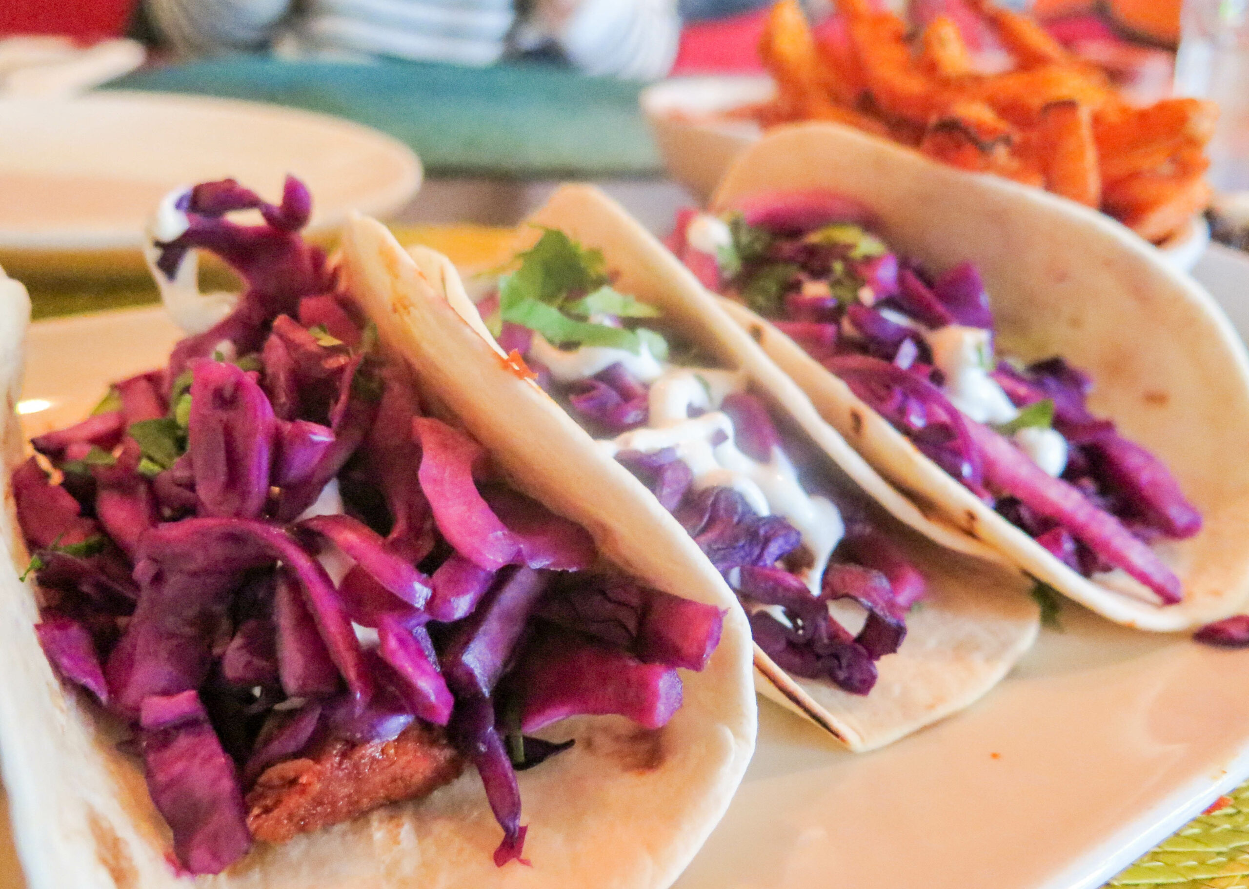 We shared the pulled pork tacos – made gluten-free by corn tortillas for flour. The tacos were served with black beans, salsa, and sweet potato chips (these also have a risk of cross contamination). The three tacos were generously filled with slow-cooked pork and red pickled cabbage. Sweet potato fries are my favourite and these did not disappoint – a must try!