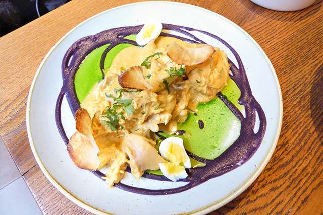 I’m a sucker for anything battered, so to kick-off I tucked into melt-in-the-mouth Aubergine Jalea – tempura battered aubergine fries – which were enhanced by a sticky sweet honey and pomegranate dressing. I’d never heard of Chilaso, but these tempura battered chilli’s stuffed with bacon and hot, melted cheese were off-the-scale delectable, and not at all too spicy for more sensitive stomachs. You can’t eat at a Peruvian restaurant and not have Ceviche, and Casita’s seabass variety is an example of this classic Latin dish done right – wonderfully fresh chunks of fish bursting with a pungent zingy, citrus flavour. Meanwhile, the Puka Pikante is one of the most stunning dishes I’ve ever seen, with earthy Heritage potatoes doused in a creamy, beetroot sauce of rich, swirling, pink tones. In contrast, the Burnt Salad – of orange slices, quinoa, watercress and a thyme yoghurt – was rather simple; but its pure and complementary flavours made no less of an impression. Last but not least, both the dessert options sounded intriguing – a flan made of quinoa or a purple corn cake – and the latter was an unexpected but delightful surprise. The steamed, thin cake layer was dense but moist and the contrasting sweet physalis jam slathered across the top was unbelievably moreish.