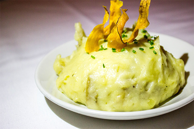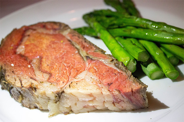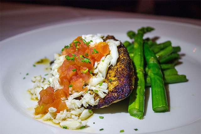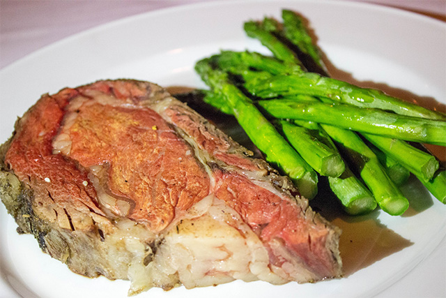 Next came the entrées – an order of Bronzed Mahi Mahi, a whopping 14-ounce prime rib, and a side of grilled asparagus. The Mahi Mahi, topped with lump crab and tomatoes, was glazed with a luscious shallot butter and served alongside some crisp green beans. The prime rib was cooked well, and was the perfect portion for two. The grilled asparagus were refreshingly crispy. The prime rib also came with a side of mashed potatoes, which were whipped and seasoned to perfection.
