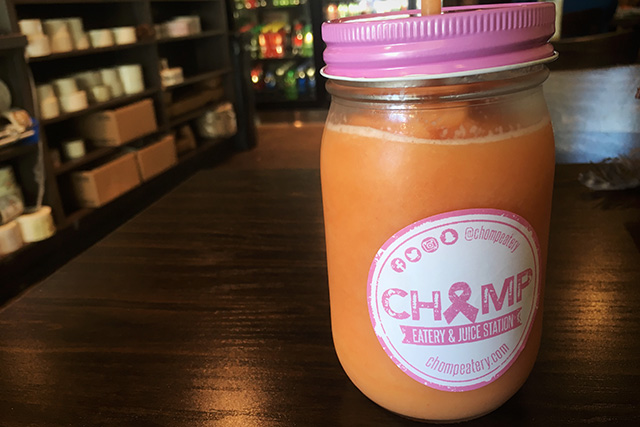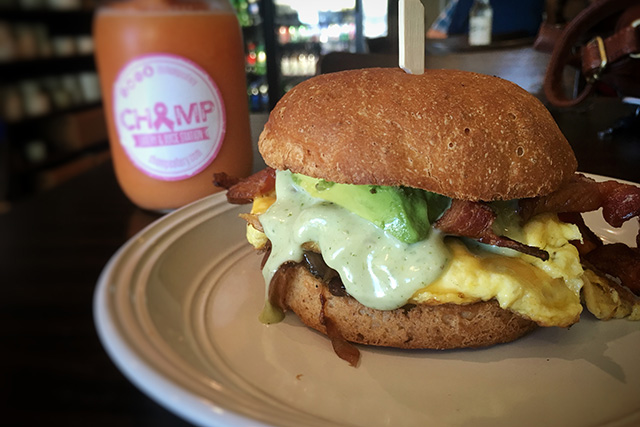 At Chomp Eatery and Juice Station, you’re greeted by an entire case of freshly squeezed juices in a bright, friendly atmosphere. Perhaps a more responsible person would make do with a juice and a salad, but I can’t be held accountable for the decisions that Sunday-brunch-me makes. For some reason unbeknownst to me, everyone in the world seemed to be eating a breakfast sandwich in front of me this week. I think we’d all agree that a world without a breakfast sandwich is a cruel world. Today, Chomp came to the rescue as I spotted the gluten free buns available on all sandwiches and burgers. Go-time.