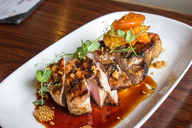 For the entrée round, I selected the Ossobaw Pork Chop, Duck Breast, and Fried Brussels Sprouts. The Ossobaw Pork Chop, maple-brined with an ancho-chili rub, apricots, and mustard was a beautiful behemoth. The entire chop weighs in at about 14 ounces, and would be a great dish to share. Each bite was extremely juicy and packed with flavor, which is not usually the case with pork chops.