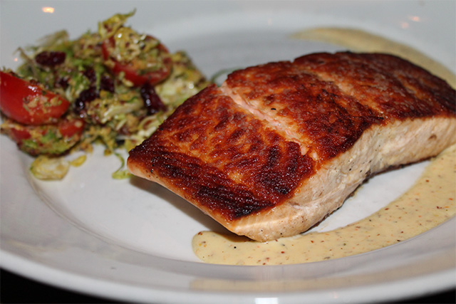 Steakhouses are a favorite for those of us who are gluten-free, as a menu full of meat, seafood, vegetables, and potatoes is right up our alley. Del Frisco’s makes dining easy, and they note GF on their menu next to gluten-free options! So what can you have?? To start, the Truffle-Chive Deviled Eggs, Heirloom Tomato & Burrata Salad, Corn Chowder, Fire Roasted Artichoke, and Kale & Brussels Sprouts Salad (just to name a few) are all gluten-free! We went with the Fire Roasted Artichoke and Kale & Brussels Sprouts Salad… the kale salad was one of our favorite dishes of the night! For mains, it was tough to choose an entrée since they all looked so delicious! We ultimately went with the Bay of Fundy Salmon and Signature Filet Mignon Steak, accompanied by Shaved Brussels Sprouts, Roasted Asparagus, and Sea Salt & Parmesan Frites. The steak and salmon were delicious, and the perfect his and her dishes for our little date night.