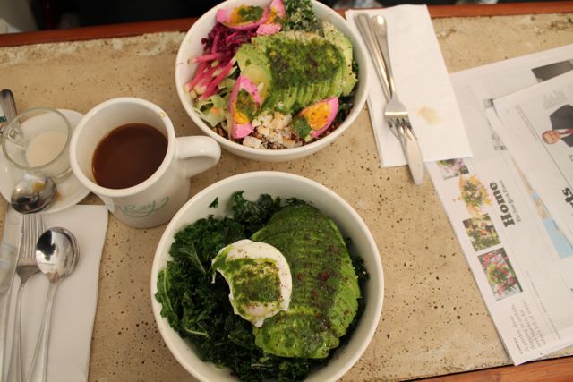 El Rey combines unique flavors to make delicious meals, and given the restaurant’s focus on vegetables and healthy cuisine, most of the menu is gluten free. The grains & crudite salad should be the reason why you’re reading this post. Although the grain in the salad — farro– is NOT gluten free, the salad can be made gluten free if you ask for it no farro. Baby greens, shaved raw vegetables, toasted pecans, and lemon vinaigrette comprise the salad, and I highly recommend adding a pickled egg and avocado to make your dish more filling. I also love the kale salad with almond slices and almond vinaigrette; and I always add avocado and a poached egg for some extra protein. The frittata at El Rey is also super popular; however, since there is bread mixed into the egg this dish is not gluten free. Given that there is no gluten free bread at El Rey, the avocado toast is also a no-go. For dinner, I highly recommend the plantain strips, papas bravas, and shaved cauliflower– all are gluten free and delicious!
