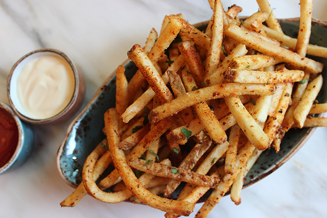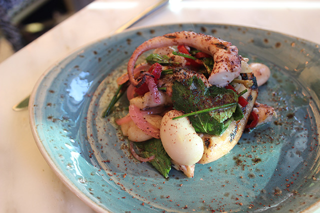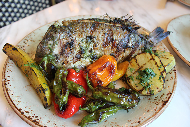 As touched on above, the menu is 60% gluten-free as is, and every dish, except the pizzas, pasta, and bread balloon (sorry!) can be made gluten-free. The new menu is best experienced shared with a group, so we recommend ordering a few salads and apps to get the meal going. For appetizers, ordering the octopus goes without saying; it is perfectly tenderized and flavored atop a bed of butter beans. The chilies and pickled onions are a nice contrast to the char on the octopus, creating a flavor bomb in your mouth. For other snacky apps, we recommend the spicy fries which are frankly one of the most delicious items on the menu and the shishito peppers. I couldn’t keep my hands out of either of these bowls! In addition, we went with the tomato and radish salad, which is the perfect summer dish, with mint, fresh French feta and a mouth watering zinfandel vinaigrette. Let’s dive into the entrees. You truly cannot go wrong here. We went with the slow roasted savoy cabbage which is a lighter dish garnished with a rich sauce and tofu, and a great accompaniment to the heartier dishes. The Citrus and Chili Marinated Whole Fish was our protein of choice here. Beautifully garnished, the branzino was seasoned perfectly and unexpectedly filling. I would go back just for that!