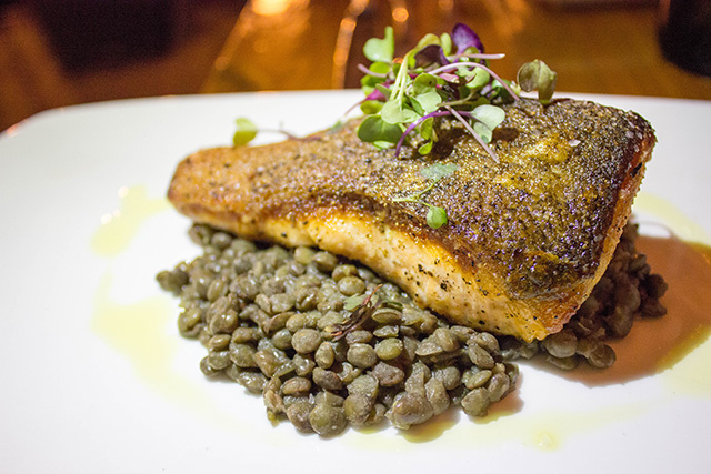 Next up came the market fish, which happened to be salmon served atop a green lentil stew. The salmon was perfectly cooked, crispy skin and all. The crunch of the skin added a beautiful texture to the buttery salmon and the creaminess of the lentils. My guest ordered the vegetable lasagna, with eggplant, roasted red pepper, spinach, Portobello mushrooms, fresh ricotta, and San Marzano tomato sauce. The dish was so unique – layered vegetables took place of the noodles, which surprisingly emulated traditional lasagna to a tee.