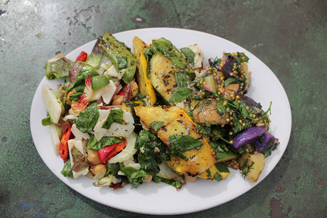 Sandwiches and pastries are a large part of the Gjusta menu, so the cafe may seem gluten-unfriendly at first. Thankfully this isn’t the case. Several of the pastries are gluten free including a buckwheat & banana loaf, chocolate & avocado mousse, coconut & lemon panna cotta, and a few smoothies/shakes. Also, although there is no GF bread, the restaurant is happy to make any of the sandwiches for you no bread. For breakfast, the frittatas are popular GF orders, but the quiches are not GF. The baked eggs, beans, greens & fried eggs platter, and smoked fish & egg plate, are all gluten free, as well. I recently went for lunch and loved all the veggie options. Mushroom caps, cauliflower with fried capers, kale salad, garden salad, beans and more are all gluten free and truly delicious.