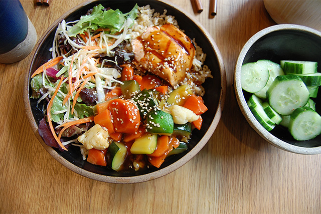 Not only does Glaze Teriyaki offer a gluten free menu, but most items on the menu are gluten-free before you add a sauce. Choose any of the teriyaki plates or salad plates and add one of three gluten-free dressings: honey lemon salad dressing, gluten free teriyaki sauce, or sriracha hot sauce. You can also add gluten-free yaki sauce for $1.50. Other gluten-free menu items include steamed edadmame, shishito peppers, and a cucumber salad. I ordered the teriyaki plate with brown rice, salmon and wok vegetables and the honey lemon dressing and it hit the spot!
