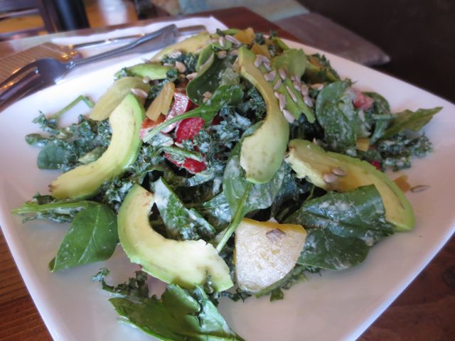 Going NOBREAD at Golden Mean is easy because the gluten free menu options are clearly noted on the menu. The menu is essentially gluten free, except for a few select ingredients, like the vegan sausage and vegan chicken. These faux-proteins contain gluten, but they are easily avoided if you ask for a substitution. Golden Mean has a unique mix of Mexican, Italian, and Mediterranean influences. For example, the gluten free tortilla is made with corn and cactus; cactus is a highly nutrient-dense food and makes the tortilla taste amazing. I love the tortilla in the Garden Vegetable Wrap. The wrap is made with homemade greens, tomato, avocado, cucumber, carrots, and bell pepper. You can also find the tortillas baked as chips in the nachos plate and smothered in salsa, black beans, guacamole, sour cream and melted daiya cheese. Golden Mean offers salads that are packed with super-foods and nutrients. The Golden Ratio Salad is my favorite and it has a dynamic mix of marinated tempeh, kale, quinoa, candied walnuts, red bell peppers and seasonal squash, dressed in a Dijon Mustard Vinaigrette. Golden Mean Cafe also has its fair share of Italian comfort food; I am dying to try the GF vegan pesto pizza on my next visit. Fresh-pressed juices, super-food smoothies, teas, and coffees are all offered, as well as mouth-watering GF cakes, cookies and pastries (the coconut Blondie is out of this world!)