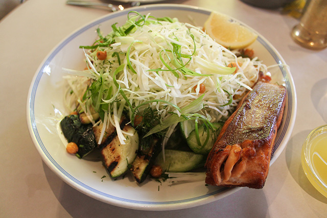 The menu at Granger & Co can be described as classic American/English, with delicious brunch items and salads, as well as larger plates and grain bowls, most of which, sadly, are not gluten-free. Three dishes that you will see on just about every table are the Scrambled Eggs with an avocado flower (gluten-free if no toast), the Fresh Aussie which consists of smoked salmon, poached eggs, greens, avocado, and cherry tomatoes (again gluten-free if no toast), and the Chopped Salad with edamame, courgette, cabbage, crunchy chickpeas, beetroot, corn, and finished with a citrus sesame dressing (gluten-free if no dressing, or ask for balsamic). My table went with the latter two, and I was thoroughly impressed with both dishes. The salad was super filling, especially after we topped it with grilled salmon, and the Fresh Aussie provides so much variety! For those who are dairy-free, the scrambled eggs are made with dairy, but you can ask for a dairy-free version!