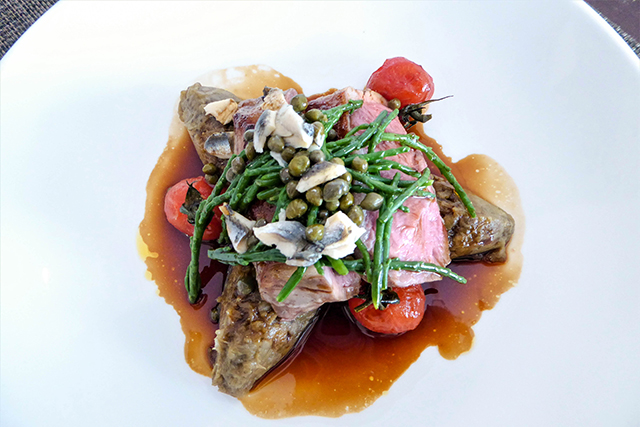 The thick, succulent, organic rump of lamb for my main course was served with samphire, which initially seemed a bit of a strange choice as this is typically served with fish – but kudos to the chef, because it provided the ideal touch of salty contrast to the hearty taste of the meat and the smooth, smoked aubergine base. Our other main course choice was a beautifully presented, perfectly pink cut of venison; its rich juiciness paired alongside the earthy tones of moreish, crisp slithers of potato and soft celery cubes.