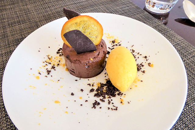 All of the dessert options were unbelievably tempting, but self control (unfortunately) kicked in. For chocolate lovers out there, the Valrhona mousse is a superb choice, and can be served with either cherry or mandarin sorbet (I went for mandarin). Its smooth, thick consistency is spot-on for hitting your sweet tooth without being too rich or sickly, and a sprinkling of biscuit crumbs adds a touch of crunch. The pressed apple and elderflower crumble was not the traditional type but no less delectable – the small tower of beautifully soft and subtly sweet poached fruit was topped with a generous sprinkling of toasted hazelnut crumbs and accompanied by a zingy blackberry sorbet.