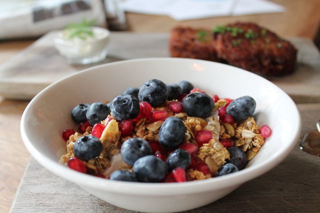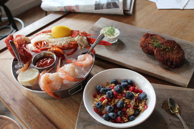 Jeffrey’s Grocery has an extensive list of shellfish platters under the “Oyster Bar” on the menu and these specialties are seen on just about every table in the restaurant…. even at breakfast and brunch! I highly recommend the shrimp and lobster cocktails; the shrimp and lobster are jumbo size and you absolutely get your money’s worth. For my meal, I started with the shrimp and lobster combo and then moved on to the quinoa oatmeal with golden raisins and granola with blueberries and pomegranate seeds. I love oatmeal and granola, but typically these dishes are NOT gluten free so you can imagine my excitement when I found out I could indulge in both! While chatting with Chef Ryan, he mentioned that he rarely adds gluten to his entrees and that items containing gluten are usually just the pastries and sandwiches.