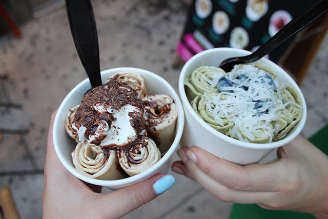 To start, we tried a pitaya acai bowl, which had a gorgeous bright pink color, and the nutty acai bowl, which included blended greens. Unfortunately, the granola isn’t gluten-free, so the bowls will all need that to be removed in order to be GF (but you can add nut butter and coconut shavings on top in place of it!!!) The bowls came served in coconuts, making us feel like we were on an exotic beach instead of in the middle of the city! And of course, we had to try the rolled ice cream. Fun fact – Juicy Spot actually came up with the rolled ice cream concept before 10Below, another NYC spot known for making this treat. Unfortunately, not all of the ice cream creations are gluten-free due to ingredients like cookies, but you can make your own ice cream rolls with a wide array of safe toppings, including fruit, chocolate shavings, Nutella and whipped cream. The ice cream is all frozen and rolled on one cold tray, which is washed down in between ice cream orders – so they do their best to avoid cross contamination. If you’re highly sensitive to gluten, you may want to avoid the ice cream rolls for this reason. Oh, and if you need a real meal to go along with your dessert, Juicy has an array of salad options, as well!
