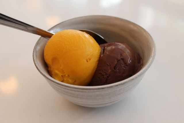 Morgenstern’s has recently become famous for their avocado ice cream toast! Unfortunately, as I expected, there is no gluten free bread at the cafe, so the NOBREAD crowd will have to sit this delicious creation out. I was, however, pleased to learn that all ice cream flavors are gluten free except for the salted caramel pretzel, as there are crushed pretzels mixed in with the ice cream. A the toppings are gluten free too except for the pretzels and honeycomb brittle. Several toppings at the cafe aren’t listed on the website, but I was happy to see all the various toppings at the store; it was obvious as to which were gluten free. When I went to the shop, I opted for the mango/passion fruit sorbet and chocolate sorbet combo. Who would have thought the combo would have mixed together so spectacularly? Then again, chocolate mixes well with just about everything!