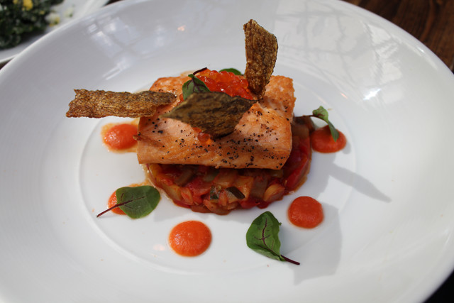 NoMo Kitchen is best known for their breakfast and brunch. The lemon ricotta pancakes are infamous, and I hear the french toast is pretty amazing, too. Unfortunately, us in the NOBREAD crowd have to sit these mouth-watering dishes out, BUT, I am happy to report that the menu indicates which items are gluten-free by placing a ‘GF’ next to GF entrees. You’ll notice immediately that a GF is noted next to the Eggs Benedict; a dish that is never gluten free, as it features eggs on, you guessed it, bread. WELL, the bread used in this dish is gluten-free… and not just for us in the NOBREAD crowd… it is served on gluten-free bread for everyone! Major points to NoMo on this one! If you’re in the mood for eggs, the egg white frittata and eggs any style are gluten-free, too! When I went to the restaurant this weekend, I went for a late brunch, and my hunger led me to order the seared salmon for something a bit more filling. The salmon dish is hearty and served with a lovely vegetable compote. The menu also notes a ‘V’ for the vegetarians out there, and I truly love how the restaurant caters to those with dietary restrictions and preferences.