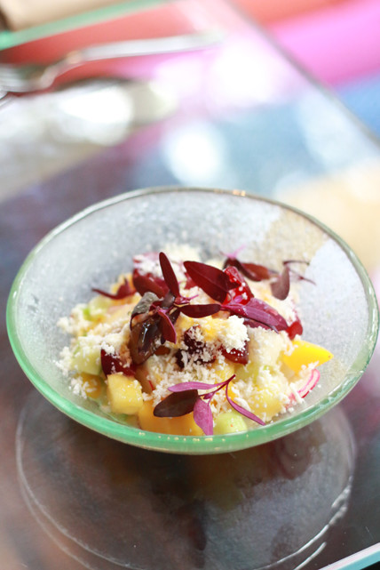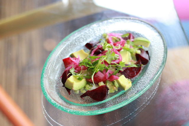 Ensaladas y Verduras – this is where you can go crazy. Obviously the “Ensalada de Alex Caesar Cardini” is a no-go thanks to the croutons, and some dishes are dropped in the fryer, but no matter – the rest are rainbow concoctions of the freshest produce around. Try the “Ensalada de aguacate y remolacha.” The juicy-sweet beets, buttery avocado, and tangy tomatillo work well together, but if you’re not an orange juice fan, order the dressing on the side because that stuff is STRONG. And I’m so glad someone thought to put queso fresco on fruit – the “‘Gaspacho’ estilo Morelia” is nothing but a bowl of light, refreshing genius, and a great palette cleanser between the heat of the peppery dishes. Another must-try is the “Acelgas con nuez de Castilla:” swiss chard sautéed with cabbage, shallots, toasted hazelnuts and spiced fruit. If you like swiss chard, you’ll end up ordering three of these. If you don’t like swiss chard… you’ll still end up ordering three of these. The nutty hazelnuts and sweetness of the fruit will make you completely forget you’re eating vegetables.