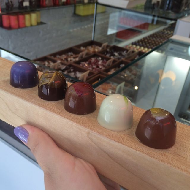 The bonbons are incredible. A bonbon has a thin layer of chocolate on the outside, and the inside has a range of fillings. The bonbons at Stick With Me are hand painted with strokes of color and sparkle. Not only are they delicious, they are works of art. I love the Black Sesame Seed Passion, because sesame desserts are so trendy right now. The Caramelized Banana is another excellent GF option. If you’re not a risk-taker, I recommend sticking with the plain dark chocolate.