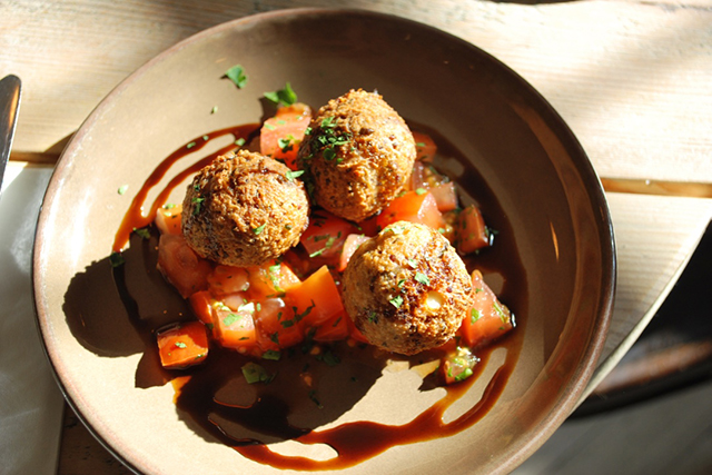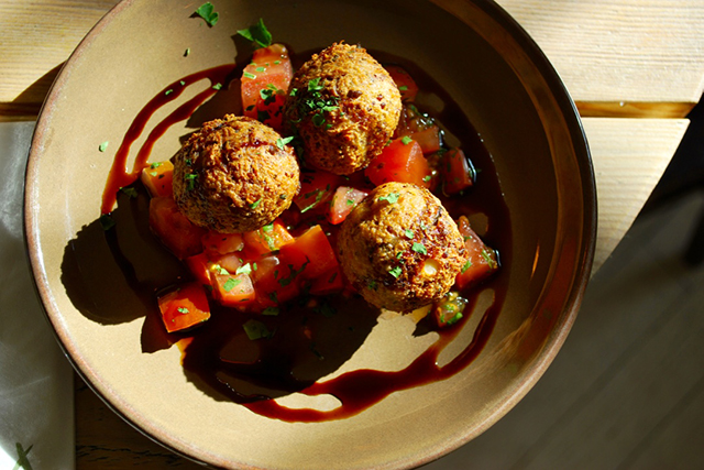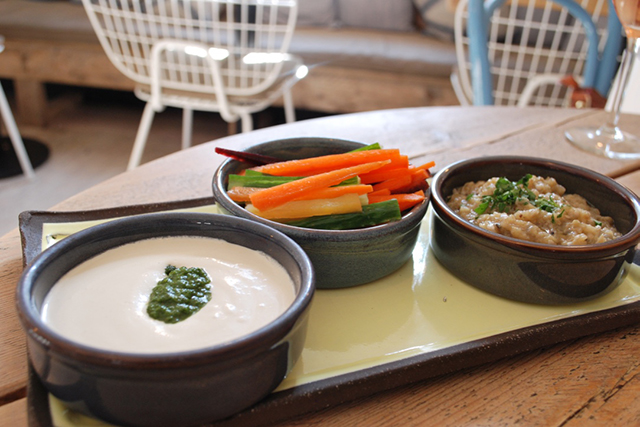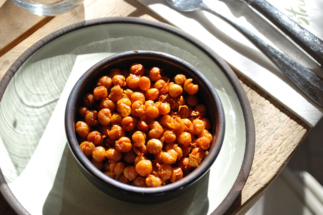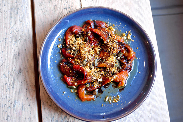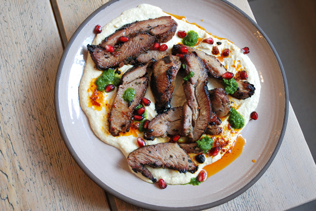 Next up was a rare find – gluten-free feta, quinoa & mint fritters that are fluffy, don’t crumble in your fingers and light, served with a fresh tomato salsa. A falafel alternative not to be missed, but do be careful as they are subject to cross-contamination in the fryer. Other exceptional vegetarian dishes to note include crispy, spicy chickpeas (the perfect snack with a glass of rosé) and the charcoaled leeks (sprinkled with manouri cheese, fried capers and sweet bites of dried apricot).