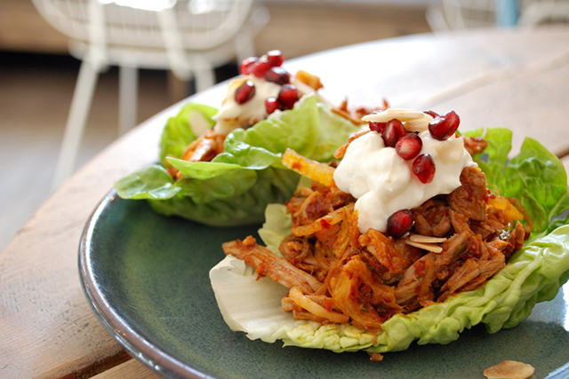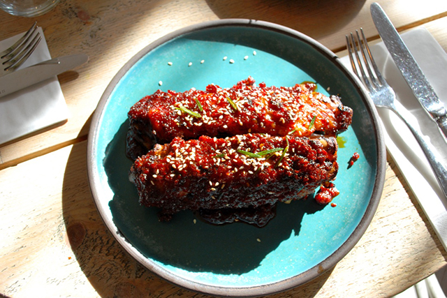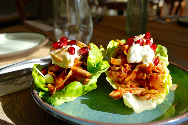But if we were to sum up the two reasons why you must come to Strut & Cluck they are: 1) Far East Middle East Lettuce Cups and 2) Sticky Wings. First, there is nothing as satisfying as iceberg leaves bursting with smoky pulled turkey marinated with harissa, a dollop of labneh and juicy pomegranate seeds for the pop – so simple, so healthy, and so incredibly good. Second, we have determined that the gluten-free turkey wings were “unimprovable” – smothered in harissa and honey and finished with fried rosemary and sesame, chicken wings will never again fit the bill.