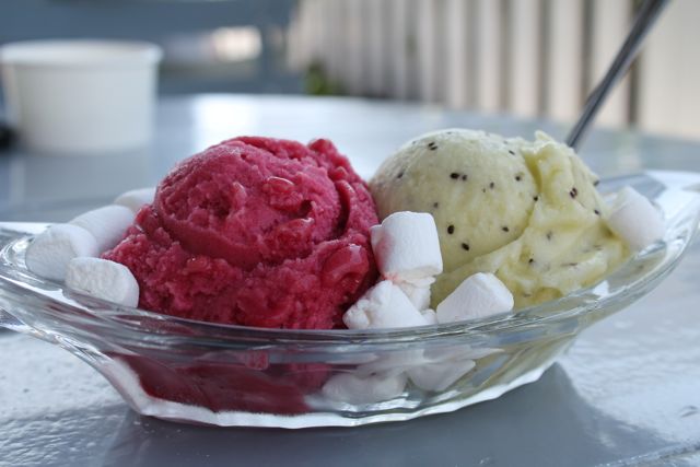 Not only does the ice cream at Sweet Rose look beautiful, but there are a large variety of flavors, including sorbet options for those who are dairy free! The flavors change monthly; staple flavors include vanilla, chocolate, mint chocolate chip, and salted caramel. I went in April and indulged in the blood orange and kiwi sorbet. Both were awesome and perfect for the fruit lovers out there. April flavors that sparked my interest include the olive oil, banana, and cinnamon ice creams. So unique! Dairy free and vegan flavors are noted as such, and all toppings are gluten free except for the crumble and brownies. Yes, that means sauces and syrups are fair game!