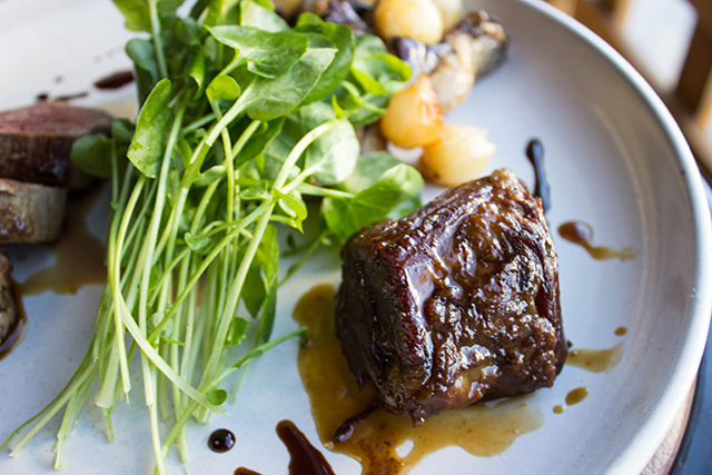 For the entrée round, I ordered the Beef Two Ways and Grilled Lamb Loin. The beef two ways consisted of braised short rib and filet mignon with bacon jus, oyster mushrooms, and caramelized pearl onion. I really enjoyed the contrast between the two cuts of meat. The filet was buttery and rich, and the short rib was fatty and delicious. The oyster mushrooms were prepared in a way that they were extremely meaty and buttery as well, despite no dairy being involved.