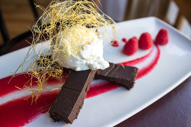 Finally, we ordered the flourless chocolate cake. This rich dessert was served with homemade whipped cream, raspberry coulis, fresh raspberries, and some beautiful golden spun sugar on top. While this dish did contain dairy, it is totally gluten-free, so make sure you save room for it. The tartness of the raspberry coulis provided a perfect contrast to the richness of the chocolate cake, and the whole thing served as the best way to end my meal that I could imagine.
