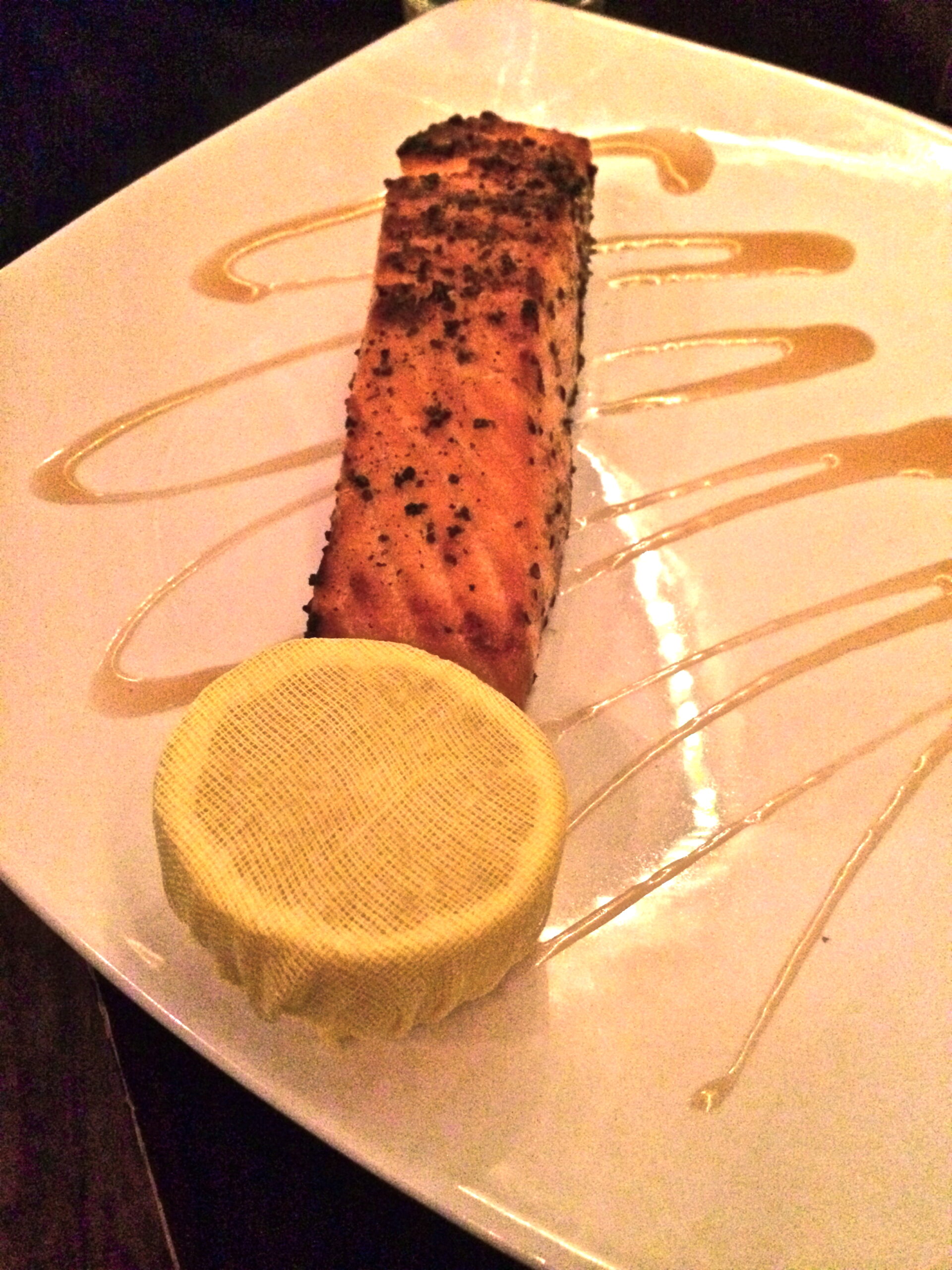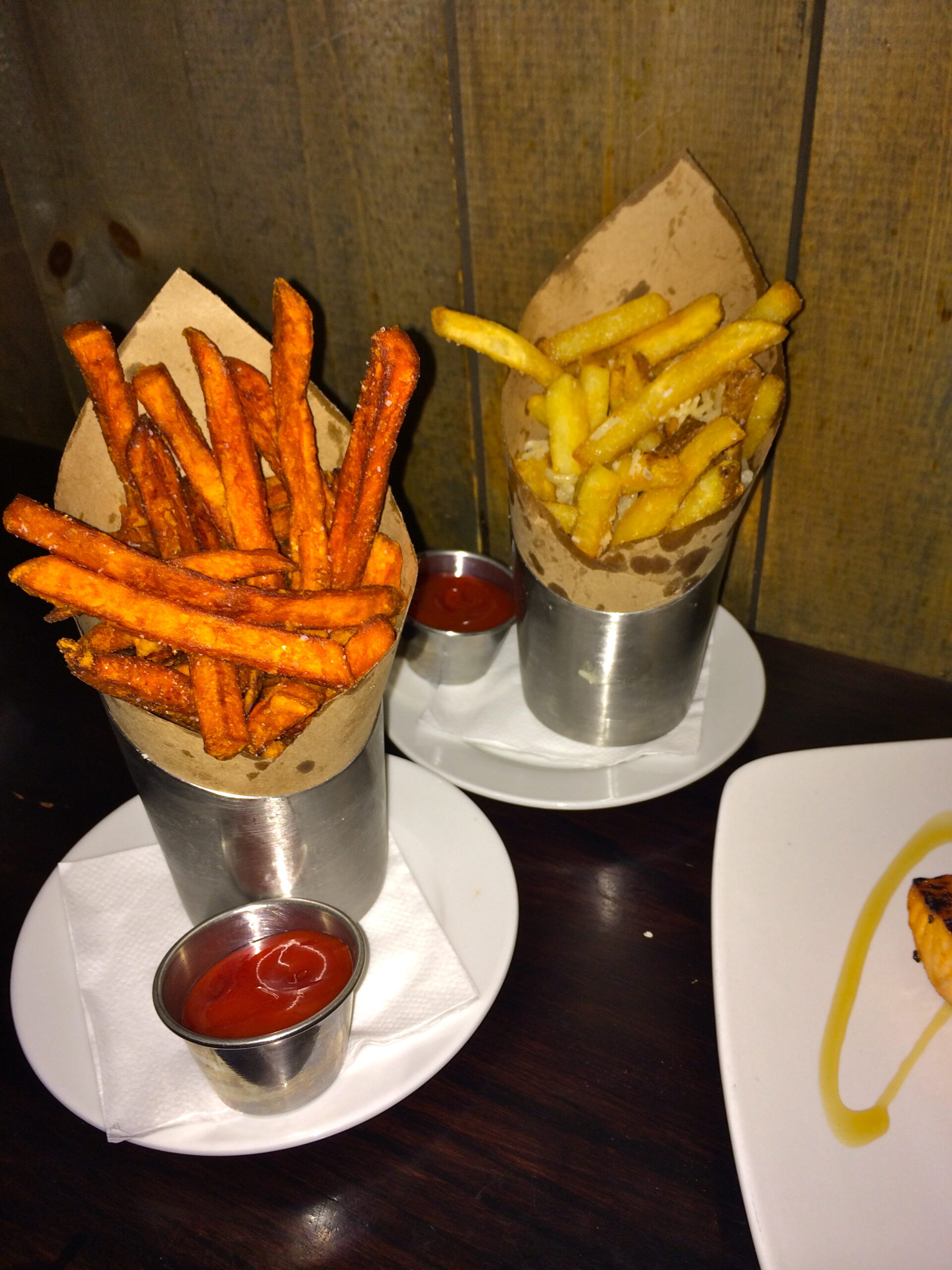 It’s always nice going to a restaurant with a guy… not only will they pick up the bill (or so you hope), but they’re down to indulge. To start, we ordered the house-made chicken wings (elegant, I know). You can get them mild, hot, or BBQ! The only other GF appetizers are oysters or vegetable crudite, so wings seemed like the most appropriate choice for a sports bar! We also ordered sweet potato fries and truffle fries, which are both amazing. They are subject to cross-contamination in the fryer, however, so skip ’em if you’re sensitive. For dinner, I ordered the grilled salmon fillet… delicious! My friend went for the skirt steak with adobo-mango marinade, house chimichurri, and a bed of chorizo hash. Luckily, he agreed to share (I ate all of his chorizo hash…) If salads are more your type, there are plenty of NOBREAD options! Grilled chicken, tomato feta, or my favorite, the fluffy quinoa. It has crisp baby spinach, cherry tomatoes, Asian pear, walnuts and maple dressing. So good!