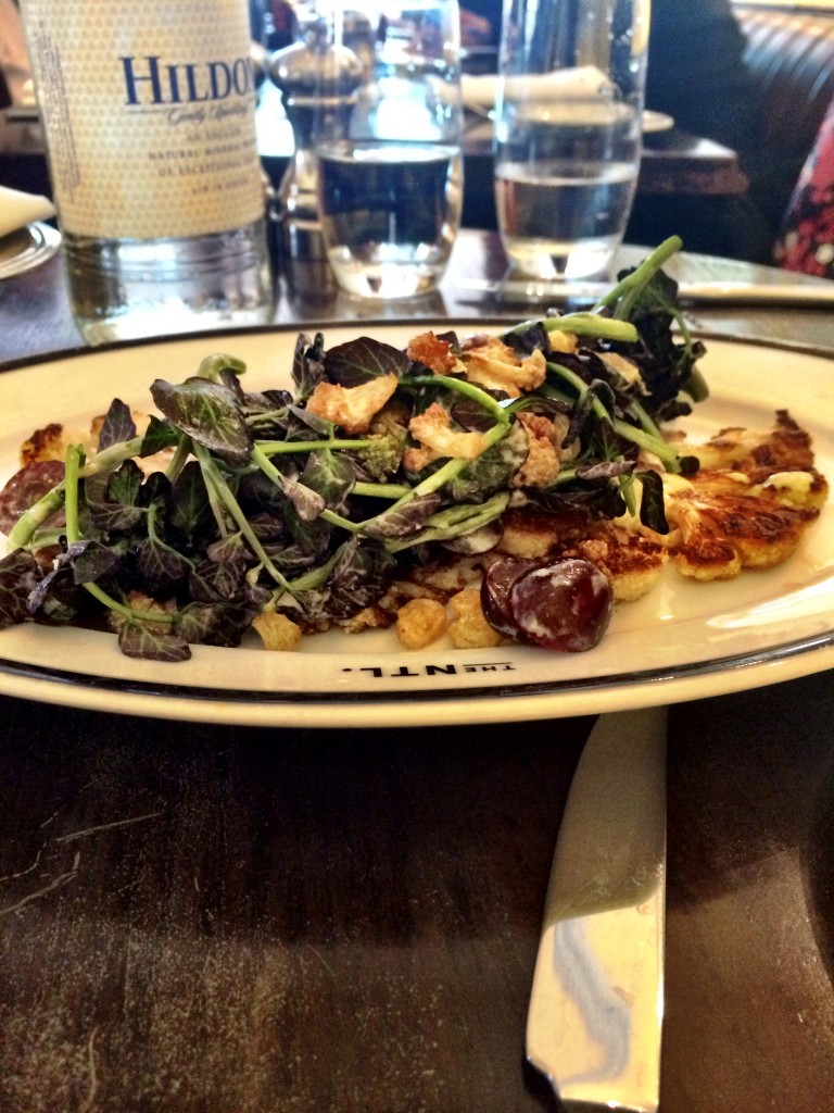 For lunch I highly recommend starting with the roasted cauliflower. This dish is roasted perfectly; it is absolutely delicious and it is topped with greens to make it a filling appetizer. As I ate, I glanced around at the tables of diners around me and noticed that salads were on just about every table, so that made my entree decision easy. The salads are unique and light, and make for the perfect lunch. The salmon with shaved fennel and arugula, the calamari with quinoa and peppers, and the salad of roasted vegetables (baby beets, sunchokes, and more) are my top nobread picks. All entrees are, or can be made, gluten free and the grilled bronzino is my top pick. Lastly, for the sides… the crispy brussels sprouts are incredible, but they are heavy on the mustard glaze so be careful if you are nodairy, too. The french fries are great, too, but they ARE subject to cross contamination.