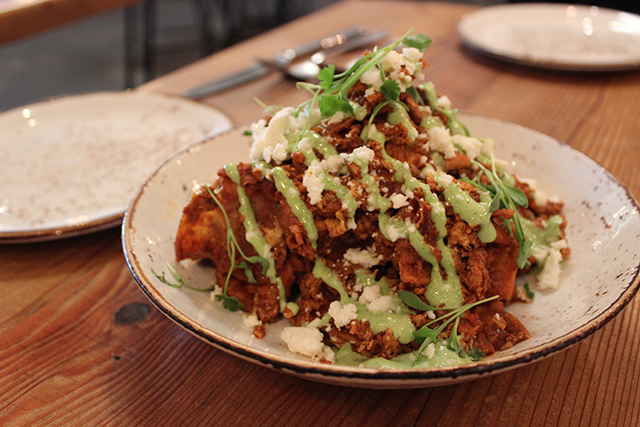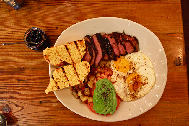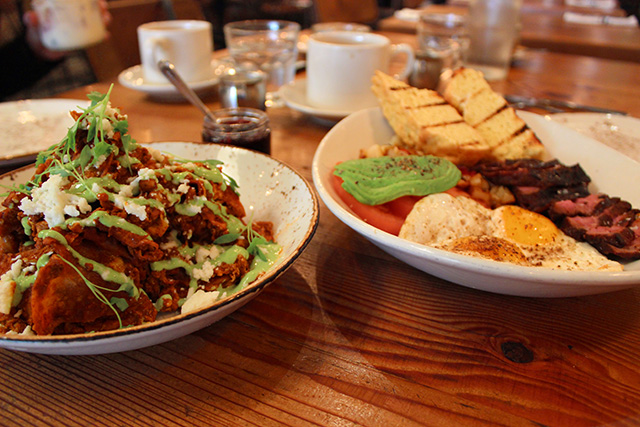 As for the savory items, we just went for it. The gluten-free chilaquiles were nothing but filling and flavorful. Chicken and eggs were scrambled into a tower of corn tortilla chips doused in a red sauce, queso freco and a crema. Naturally, we complemented with another heavy hitter: steak and eggs. This hearty protein packed plate is served with avocado, potatoes, toast and a homemade jam. The gluten-free sub for toast is a soft baguette slice of sorts, seemingly hard to find with gluten subs, and the seasonal jam was a homemade blueberry that was delicious! Thankfully we were both very hungry and shockingly able to finish. Both.