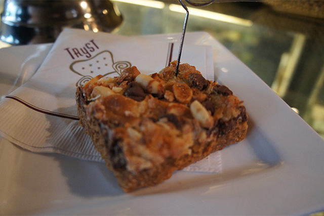 Tryst is extremely nobread friendly and it carries an assortment of gluten-free pastries! All of the pastries are baked fresh every morning and are stored in a separate display case from the gluten-filled pastries. The Magic Bar had everything you could imagine: from peanuts, to chocolate chips, to coconut; it is the most popular gluten-free option and I can see why! The Magic bar was the perfect combination of soft and chewy. There were also two gluten-free muffins (Maple Almond and Orange Cranberry), as well as a chocolate mint cookie. If you are not in the mood for a pastry, Tryst also offers a handful of gluten-free brunch and “munch” options. For brunch there is a Spinach Frittata and Yogurt with Fruit. My favorite brunch option however is the Jalapeno Corn Bread Waffle. “Munch” is served all day and offers gluten-free patrons Spinach Dip and Roasted Garlic Hummus with homemade potato chips and vegetables instead of flatbread and nachos.
