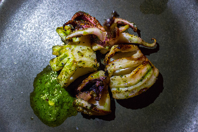 For the first real course, I ordered the Charred Kale Salad, the BBQ Carrots, and the Grilled Squid. The salad, which contained an interesting mix of apple, fennel, red onion, and gluten-free flax crackers, was dressed with a flavorful pumpkin seed vinaigrette. I was most impressed with how the flavor profile of the kale transformed so intensely just by being charred quickly before plating. This type of flavor metamorphosis of vegetables is no strange technique for this restaurant group, as it is also found at The Royal, Vinoteca’s sister restaurant.