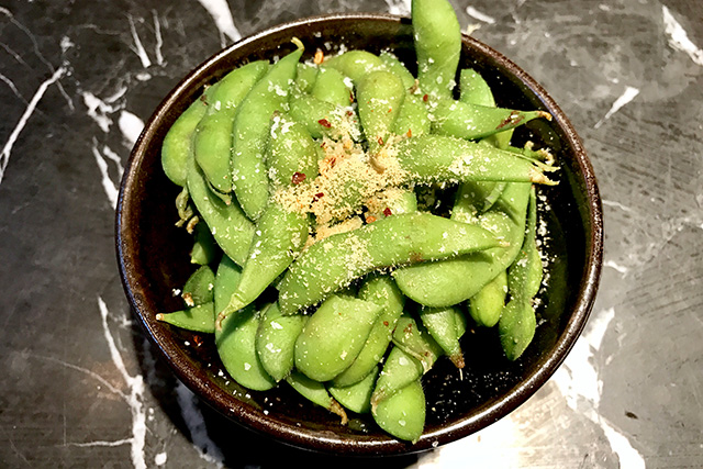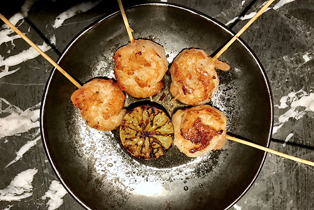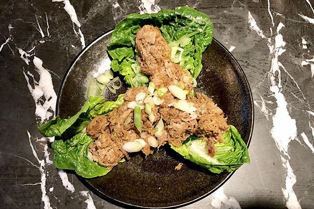 We began our meal with the steamed edamame sprinkled with chili-garlic salt; a perfect start. We then tried the lollipop prawn kushiyaki: skewers of grilled prawns marinated in lemongrass, lime and chili. For a moment, we were transported back to the beautiful islands in the south of Thailand. Spectacular. Next, the waiter brought out the duck wraps: shredded, crispy duck, cucumber and scallions in a lettuce wrap.